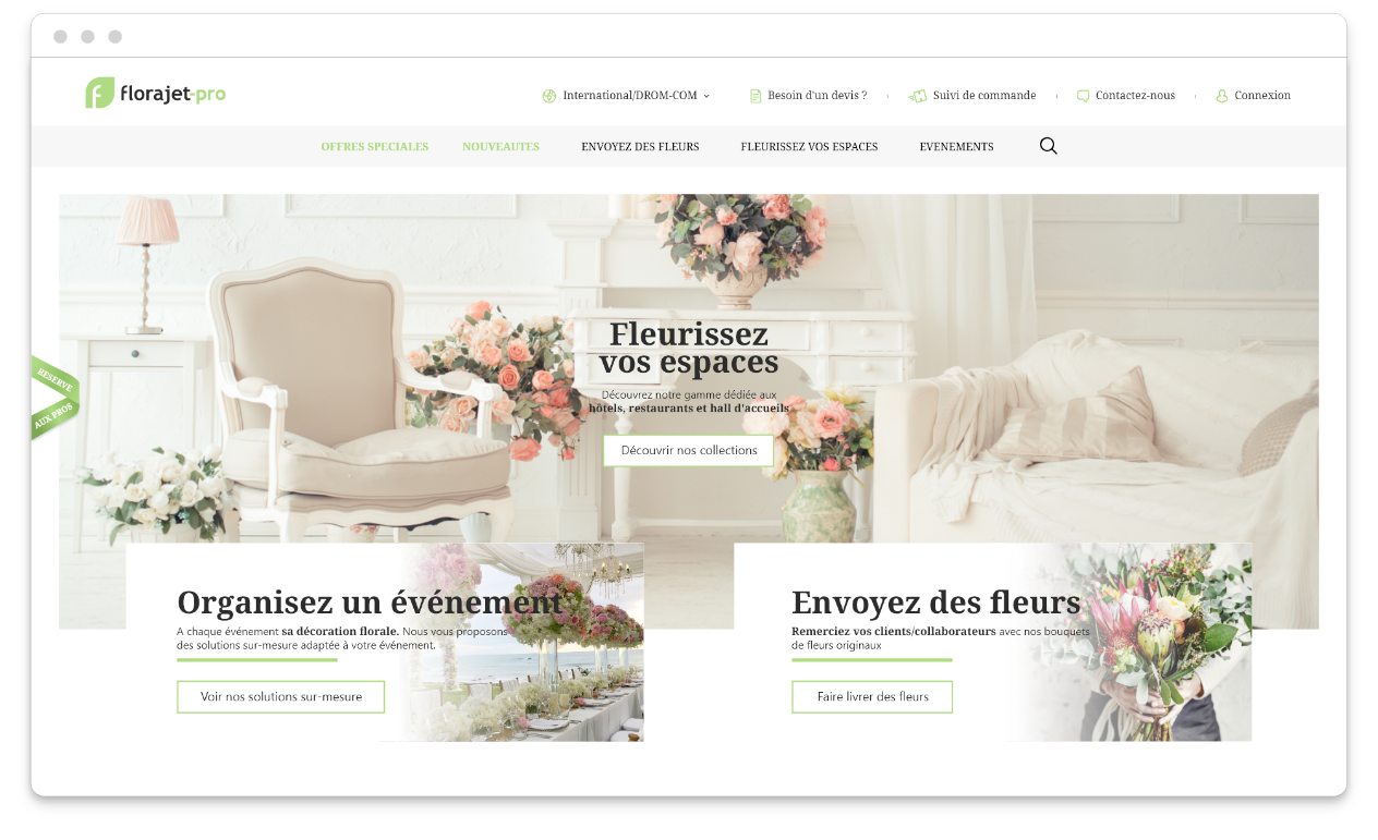 Accompagner les professionnels dans leurs choix floral et dans leur comptabilité avec une plateforme dédiée, tel fut la mission de Florajet en imaginant Florajet-pro. Ma mission consistait à travailler sur le design de l’interface et d’imaginer un tunnel de commande efficace et intuitif permettant aux professionnels de commander aussi bien pour un grand événement (salons EDF, Renault…) que pour offrir des fleurs à des clients/collègues.