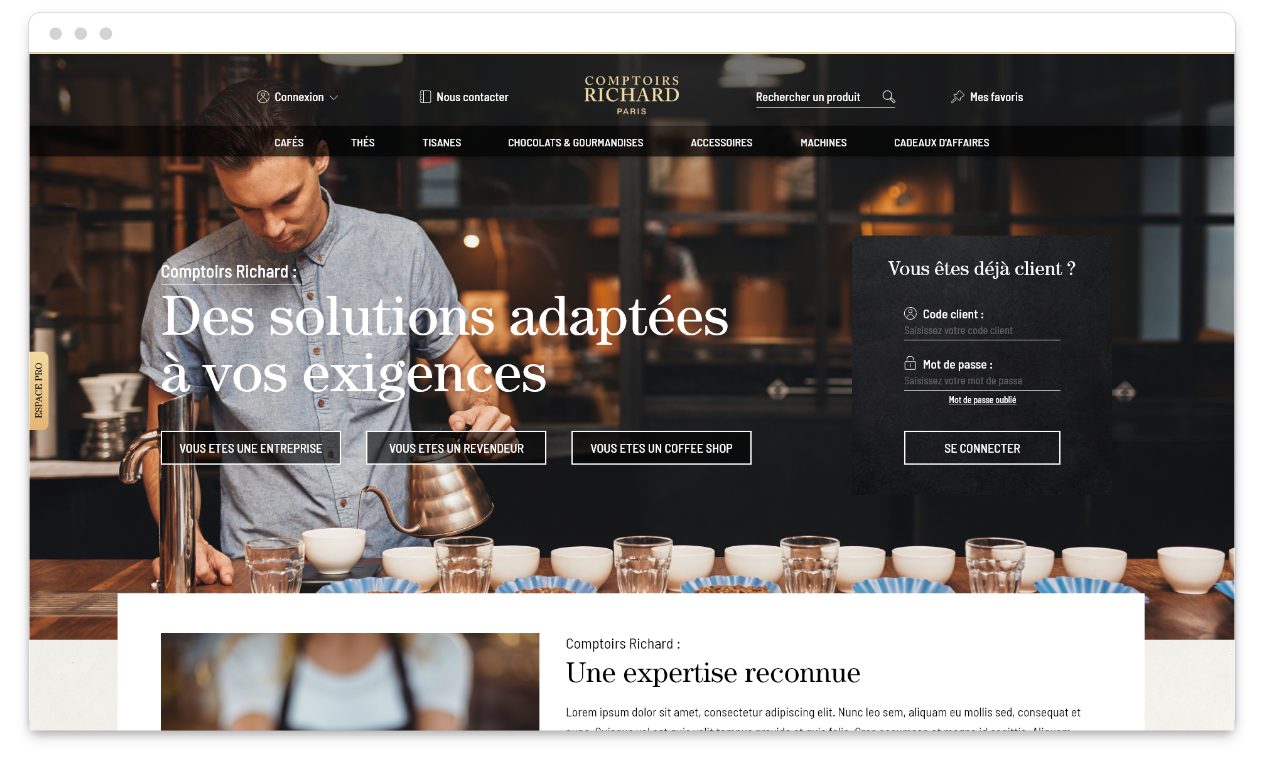Comptoirs Richard souhaite prolonger l’expérience numérique jusqu’alors uniquement dédiée aux particuliers, aux professionnels en leur offrant l’accès à une plateforme de E-commerce réservée au BtoB. Devis en ligne, gestion des collaborateurs et gestion des habitudes de commande sont au rendez-vous. Il fallait pouvoir rendre cette plateforme agréable visuellement, simple d’utilisation et proposer de nouveaux produits aux commerçants.