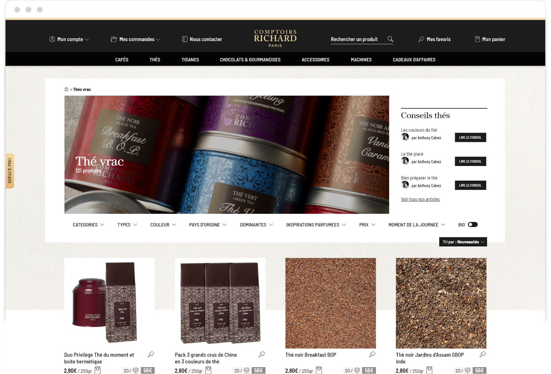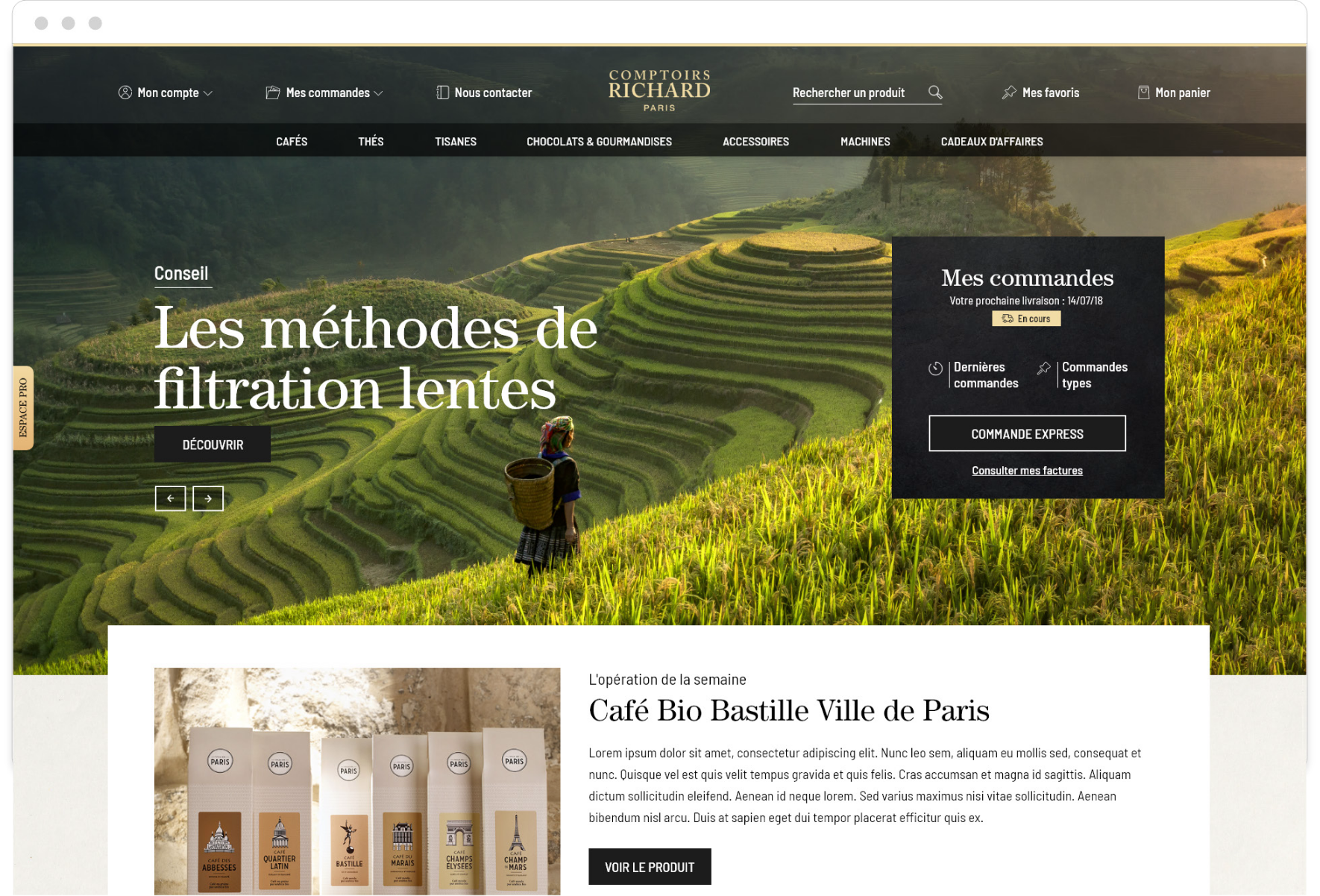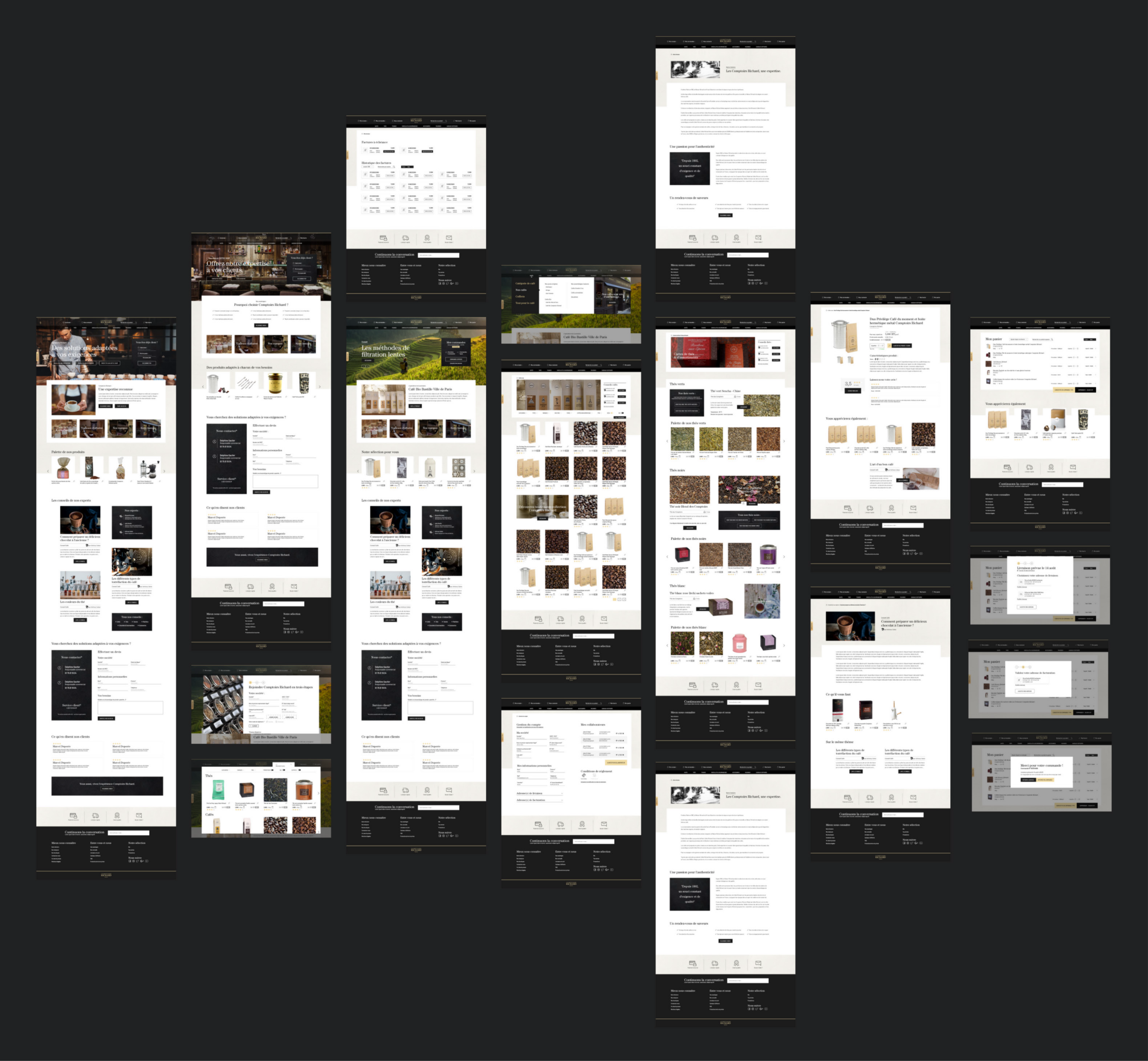 Le projet d’accompagnement de la société Comptoirs Richard dans le développement d’offres dédiées aux profesionnels à nécéssité une modernisation de l’identité visuelle. Tout en gardant les couleurs et le logo pour ne pas dénaturer le caractère historique de la marque, j’ai conçu une interface avec de nouveaux codes graphiques, qui seront également utilisés lors de la refonte de la plateforme pour les particuliers.