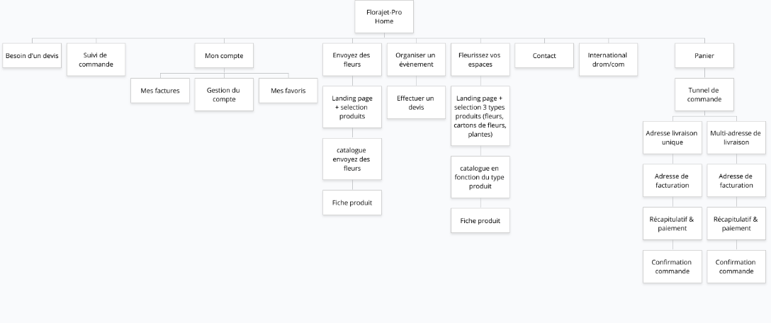 L’architecture de l’information a été travaillée pour faciliter l’accès aux contenus aux 3 types de demandes possibles par les professionnels. Sur la landing page actuelle Florajet-pro, les demandes de devis étaient principalement liées à des événements et la livraison de fleurs pour une occasion ou fleurir les locaux de l’entreprise. Sur la home, nous avons convenue à un accès direct aux 3 rubriques principales. Les fleurs/plantes et cartons de fleurs sont classées selon ces rubriques. Florajet-pro, avec son service client basé en France, accompagne ses clients dans la prise de commande, la prise de décision et sur le déroulement de leurs événements. C’est donc pour cela que sur la plupart des pages, l’utilisateur peut retrouver avec facilité les numéros du service client.